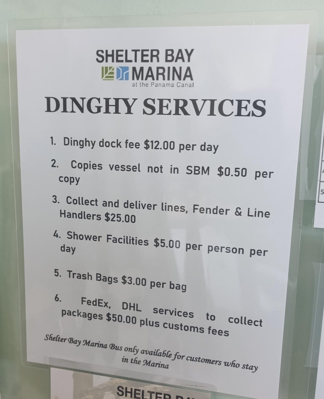 Services include haul out facility/full service yard, secured storage, fuel, sail loft, laundry, Wi-Fi (extra), chandlery, LPG refills, transport to/from Colon, van service to Panama City, clearance services, bar & restaurant, pool, gym, 24/7 security. More info. on the full services and rates can be found on their website.