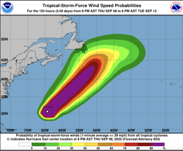 “Earl is expected to further accelerate Thursday night and make a more northeastward turn Friday. It’s also growing larger, with hurricane-force winds extending outward up to 60 miles (95 kilometers) from the (hurricane’s) center.