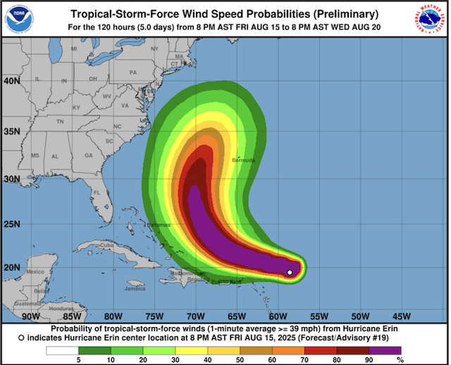 Forecasters expected Erin’s path to curve northward, with the hurricane likely passing near the northern Leewards – which stretch from the Virgin Islands to Guadeloupe and include St. Martin, St. Barts and other islands – on Saturday August 16.