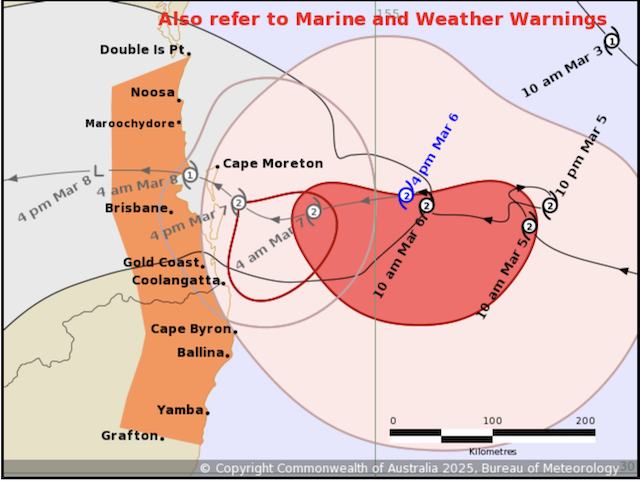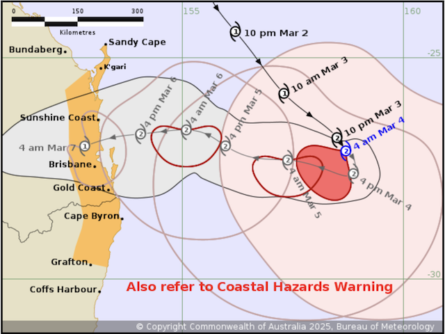 Tropical Cyclone Alfred has intensified into a Category 2 system and is forecast to turn towards south-east Queensland later on Monday March 4 according to Australia’s Bureau of Meteorology (BOM).