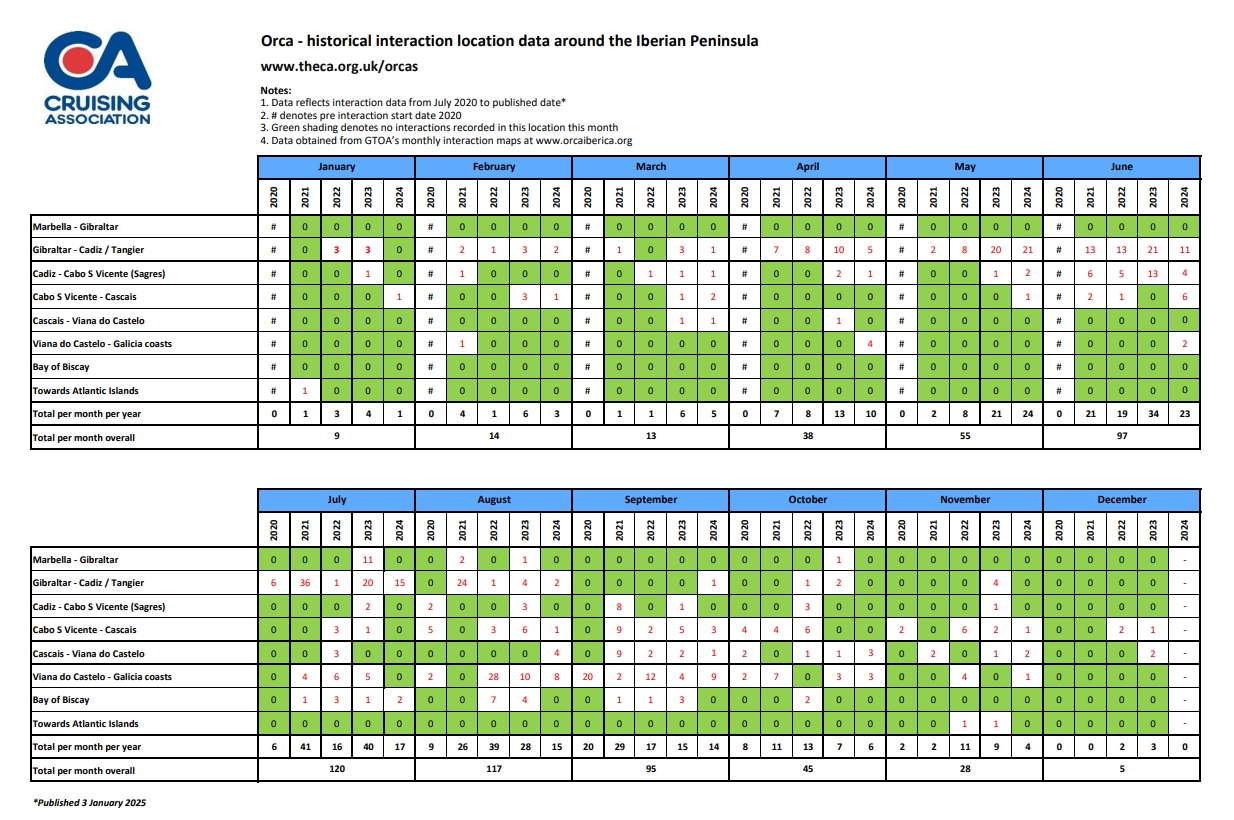 It analyses orca interactions from 2020 to the present, covering the Atlantic coasts of France, Portugal, Spain, and the Strait of Gibraltar. Based on monthly data from Grupo Trabajo Orca Atlantica (GTOA), it provides the interaction locations by year and month. Because they are not made aware of absolutely every interaction, the GTOA information cannot be regarded as 100% accurate, but it is very comprehensive and provides a useful guide as to the likely risk of an interaction.