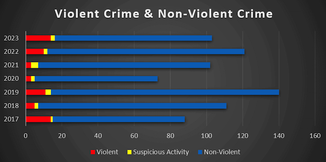 Reported Non-violent crime (burglary, theft, vandalism, other) was reduced 20% in 2023 from 109 to 87 incidents. However, Violent/Serious crimes have continued to ramp up post-Covid.