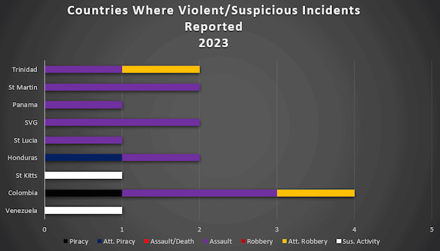 The multi-island nation of St. Vincent and the Grenadines (SVG) again tops the list with 11 reported incidents, (primarily theft) spread throughout its many islands. SVG incidents dropped significantly from 26 total incidents in 2022. In 2023, Bequia (where Coast Guard patrols were instituted) and Saint Vincent each contributed 3 to the total 11. Assaults occurred in Buccament Bay, Saint Vincent (also in 2022) and for the first time in Saline Bay, Mayreau.