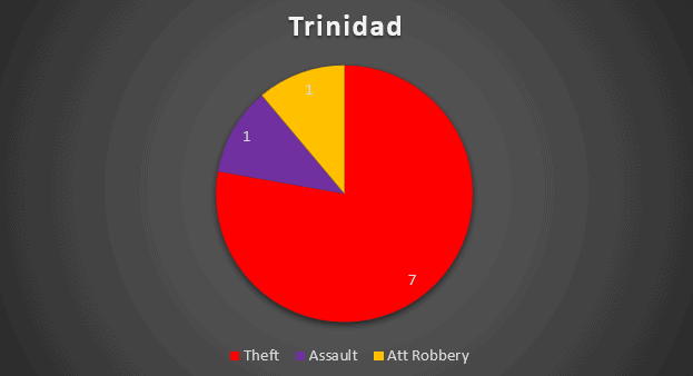 Trinidad is new to the top list and reported 9 incidents in 2023, 7 thefts and 1 each attempted robbery and assault. All occurred in Chaguaramas, with the exception of the assault in nearby but isolated Scotland Bay.