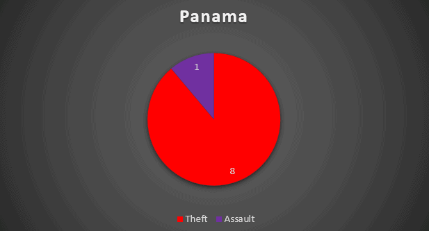 Panama (9) returns for a third time to the top group with 9 recorded incidents including an assault in Portobello. The remaining thefts (8) were spread principally throughout the Bocas Del Toro island group.