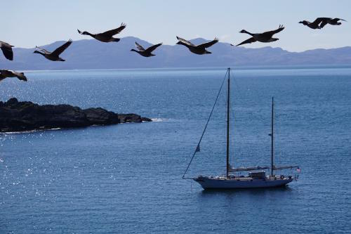 SV Irene in Holly Isle, Scotland with Geese. (photo Ginger Niemann)