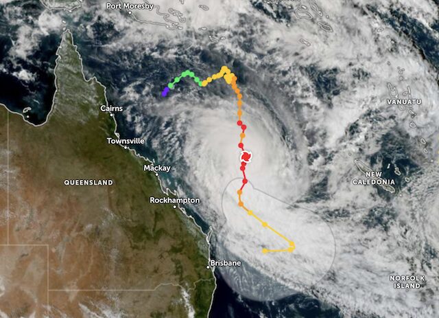 Australia’s Bureau of Meteorology says the path of Tropical Cyclone Alfred remains uncertain. Image from Zoom Earth.