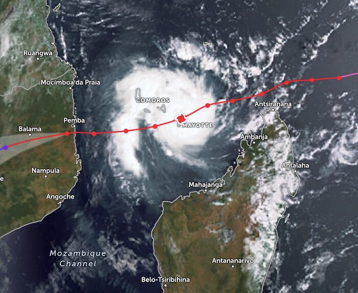 After hitting Mayotte, the storm intensified overnight as it crossed the Mozambique Channel, battering Mozambique’s coastal city of Pemba with heavy rains and winds gusting up to 185km/h (115mph).