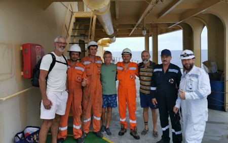 - Casper Venter (left) and his two crew members are pictured with some of the crew from the oil tanker. Photo from Global News Ca (c) Casper Venter.