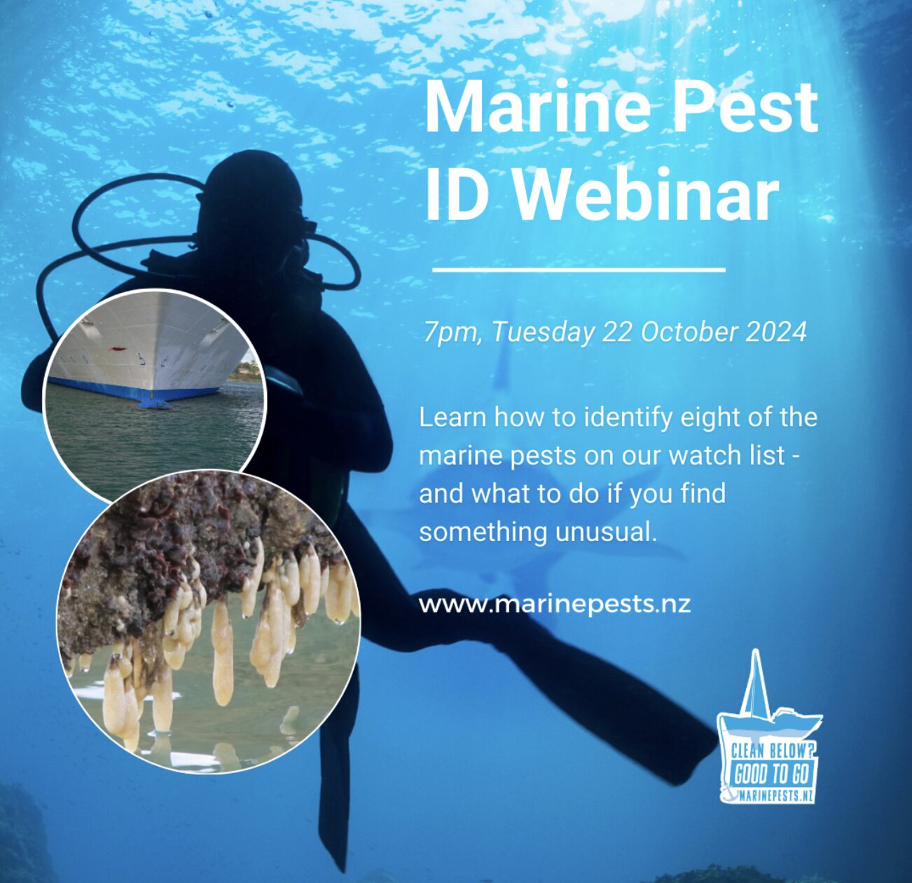 The webinar is being hosted by Marine Pests NZ – which runs the “Clean Below? Good to Go” education campaign to raise awareness of the role biofouling plays in the spread of marine pests. It is being held at at 7pm on Tuesday 22 October (NZ Daylight Saving Time) and will help commercial and recreational boat owners and crew learn how to detect and identify some of the marine pests which threaten New Zealand’s natural coastal environment.