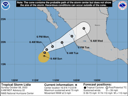 The NHC said Lidia was moving east-northeast at 17 mph (28 km/h) and should weaken quickly as it moved over elevated terrain in west-central Mexico.