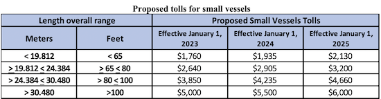 Note: This was made official July 2022 and yachts will see an increase in tolls from January 2023.