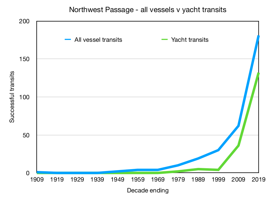 The following graph shows the number of transits of all vessels and of yachts voyaging through the Northwest Passage since it was first transited by Amundsen in 1906:
