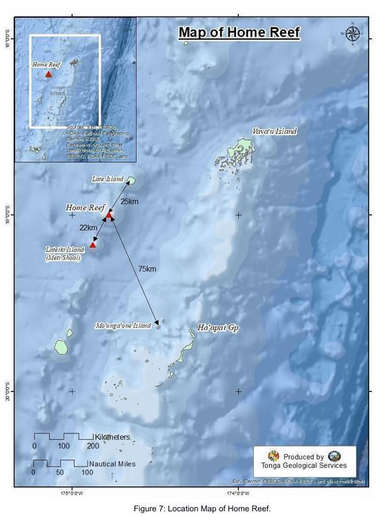 Home Reef is a submarine volcano located in the central Tonga islands between Lateiki (Metis Shoal) and Late Island. It is located 25 km southwest of Late Island, 22 km northeast of Lateiki (Metis Shoal) and 75 km northwest of Mo’unga’one Island at Latitude 18.992°S and Longtitude 174.775°W.