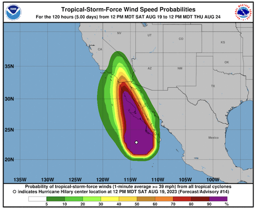 In an Advisory for Hurricane Hilary, NOAA’s Hurricane Center said hurricane conditions were expected along the west-central coast of the Baja California Peninsula Saturday night and into Sunday.