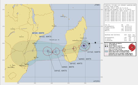 The US Navy’s Joint Typhoon Warning Centre (JTWC) said Cyclone Freddy had passed southeast of Antananarivo on Madagascar and was tracking west-southwestward at 16 knots with maximum sustained surface winds estimated at 100 knots, gusting to 125 knots.