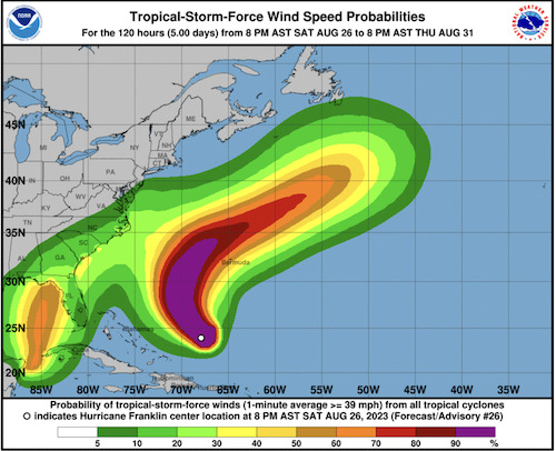 Swells generated by Hurricane Franklin are expected to begin affecting Bermuda by Sunday night, August 27. These swells are also likely to cause life-threatening surf and rip current conditions later this weekend into early next week along portions of the U.S. East Coast.
