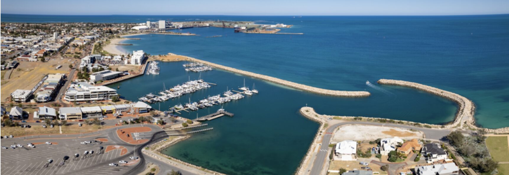 The new marina encloses a large area within its overlapping breakwaters. There are three pontoons, one of which is for recreational boaters.
