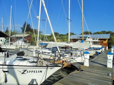 We are anchored, along with another boat, inside the harbor. We are both anchored in 10′-12′ of water with our sterns close to the new southern wharf. There is no place to secure our sterns to the wharf, but if there were a few more boats we might all need to set anchors or stakes on the wharf to keep sterns from swinging.