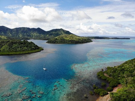 Coming through the pass, proceed straight into the deep bay of Lomati which is an excellent, sheltered anchorage, 10 – 15m over mud with good holding and is protected in all wind directions except NW. Cruisers report that it may take a while for the hook to sink into the mud, before gently pulling back, but once set, it's set.
