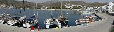 Tucked just inside the NW part of the island this small harbor lies off the village of Yialis in the SE of the bay. It is always quite crowded and if berthed on the town quay can be noisy with music from the waterfront bars. Moor Med-style to the quay clear of the ferry. Holding is not that good. There is water on the quay. Charging is inconsistent.