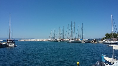 Situated on the NW corner of the island, the harbor can easily be spotted by the village on the hill above it. This harbor is busy with hydrofoils and ferries. In strong southerly winds the harbor may become untenable.