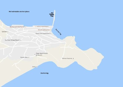 The town quay in Koroni is too shallow for docking, good holding in mud, but watch for boulders in the area around the breakwater. Better anchoring off the beach.