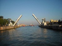 Just 3.2 kms (two miles) north of the river is the Fiumicino canal, which offers lower-priced berthing (with buses to Rome). However, it is not advisable to enter the canal in on-shore winds above F3. It is very close to Rome's very busy airport. There are two bridges - a lift (bascule) footbridge and a vertical-lift road bridge (thanks to Tom Walton for the photos).