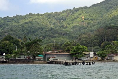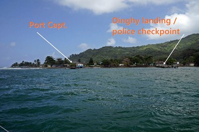 Photos: View of Obaldia waterfront showing the location of two piers (police dock at right for entry), and closer view of police pier for dinghy landing to go ashore. Thanks to SV Totem.