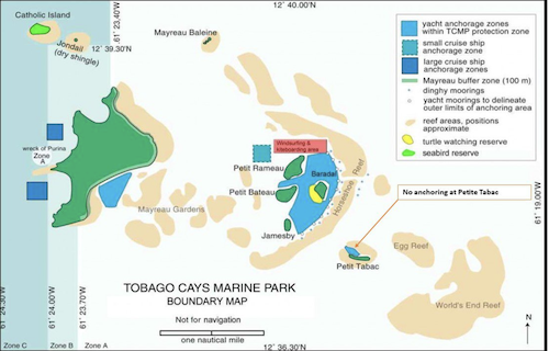 Significant damages to corals caused by the anchoring of yachts in and around the Petit Tabac area of Tobago Cays has resulted in the Tobago Cays Marine Park management placing a ban on ALL anchoring in that area. The change in permitted anchoring zones removes the small anchoring zone adjacent to the cay of Petite Tabac, which is located outside the main lagoon of the Cays, on the windward side of Horseshoe Reef.
