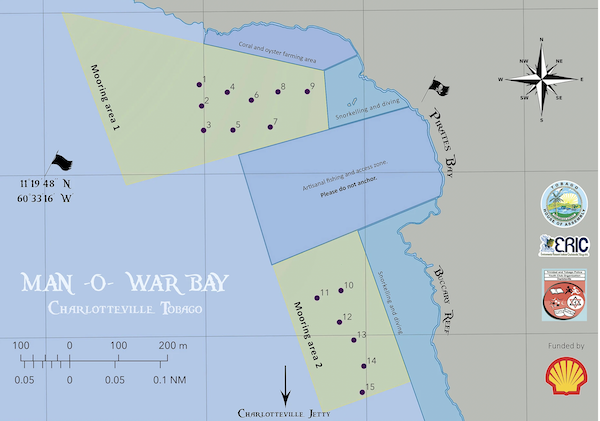A new mooring field containing 15 buoys has been installed in the Pirate's Bay area of Man-o-War bay by Tobago's Environmental Research Institute Charlotteville (ERIC). There are two mooring areas and anchoring within those areas is not permitted for recreational vessels.