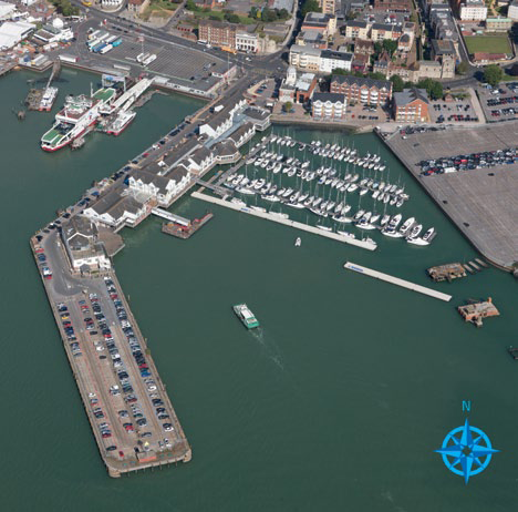 The marina entrance is a dogleg between two floating wave breaks that appear continuous from seaward (see photo). Call VHF Channel 80 on approach. The marina offers 24/7 berthing assistance. Beware of the adjacent Red Jet Hi-speed ferry. Craft > 20m must get clearance from Southampton VTS to enter/depart the marina (VHF Channel 12).