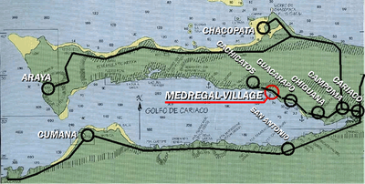 On Venezuela’s northern coast, stretching east from the city of Cumaná lies the Gulfo de Cariaco. This huge, sausage-shaped bay encompasses a wonderful multi-coloured scenery of contrasting hills.  It is regarded as a safe place to visit and has many small, snug coves. The northern shore offers better protection than the southern coast.
