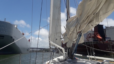 Sometimes a big ship comes in and then you must leave the sheltered harbor near Club Nautico. We did not mind because there were a lot of mosquitos there. So actually, in front of the Armada building we found it more pleasant: a bit more rolly, but also more wind and out of the reach for the Sargassum-weed beaching.