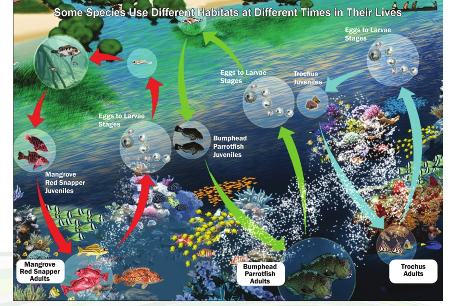 Coral reefs, seagrass and mangroves provide critical habitat for many marine animals, for spawning (e.g. reef fish), feeding (e.g. turtles) and as nursery areas (e.g. for reef fish and sharks). Tabu areas should include habitats that support different life cycle stages. For example many fish babies need the protection of mangrove forests to grow up, later they spend their adult lives on coral reefs.