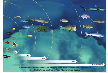 The size of tabu areas is also critical to their success. Tabu areas on fringing reefs should protect from the shore across the reef flat and out past the reef crest to ensure all species in the area are offered protection. The size of the tabu area will depend on the life cycle and natural range of movement of the protected fish species. If the tabu is not big enough to cover all endangered species it makes sense to protect these species even outside the tabu! For example no shark fishing all around the island, no grouper fishing during the spawning season, etc.
