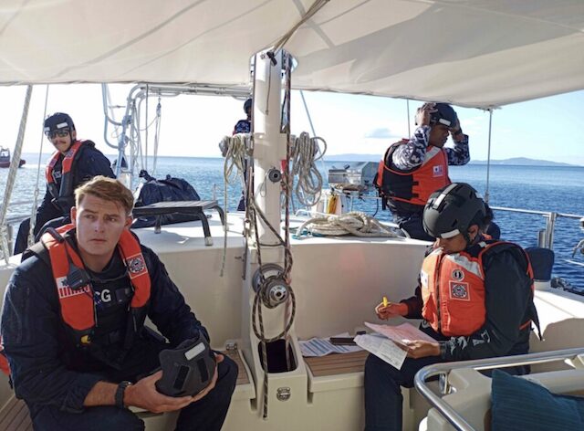 A part of the boarding team included a US Coast Guard member. I guess the USA has nothing better to do with their taxpayer’s money. I could see the USCG Cutter in the distance and suggested to him to radio the ship and ask them if they could see us on AIS and to report our location. Needless to say, this didn’t happen. They were just trying to use the justification of checking to see if our AIS was on as an excuse to board our home, again.