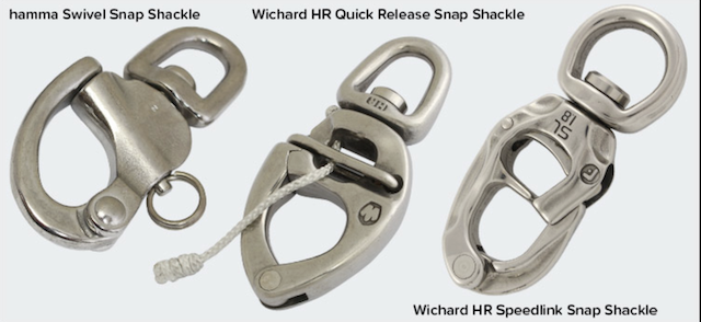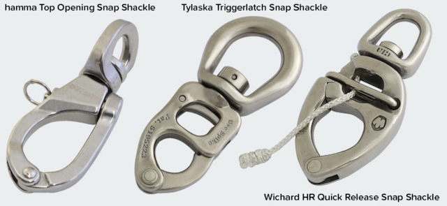 • Top-opening snap shackles provide a reliable connection with the option of quick release. The arm hinges at the top so that the line can’t remain hooked at the point of release. Basic models use pull-pins, which can be rigged with a lanyard for an ergonomic pull.