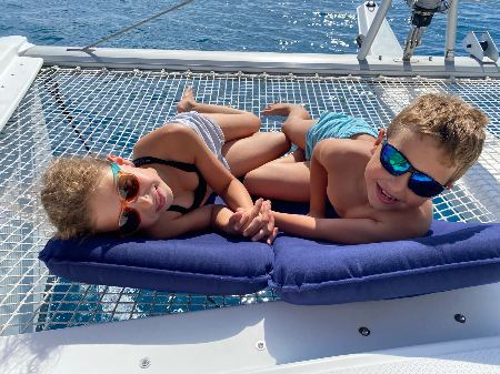 It rains practically every day, more at night than during the day. But you always get wet. That’s why we only make a small fire on the beach to grill marshmallows. A hit with the kids. The beach section that we choose for this is completely empty except for two stray hungry dogs and unfortunately a lot of mosquitoes. The sand is the finest. Here Hannah records her kids workout for her new YouTube channel. We are excited. Hannah trains several times a day on her own. Both children enthusiastically jump into the water from the bow, let themselves be carried to the ladder and start all over again. Elias does a half-twist somersault with ease, and swimming and snorkeling are the order of the day.