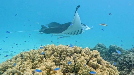 Our first stop was Tikehau for a week in August, unfortunately it was upwind, so we motorsailed. There are two must-see spots here, but possibly only seasonal. One is a snorkel spot where the graceful reef mantas get their mouths cleaned by little blue fish. The other is an amazing group of thousands of fish just outside the pass. The best advice with finding the special secrets on the Islands is to ask a local, they are thrilled to help or even take you there.