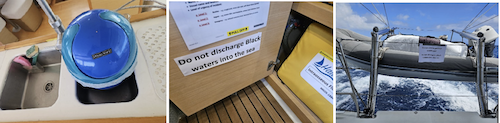 They inspected our galley fridge, but didn’t look in our outside deep freezer, perhaps, with hindsight, because we forgot to point it out to them! They wanted to inspect one life jacket and asked about the man overboard equipment and liferaft, which we pointed to, but they didn’t inspect them. They asked questions about our holding tanks and inspected the valves and their accompanying notices; this was clearly a key point for them to inspect.