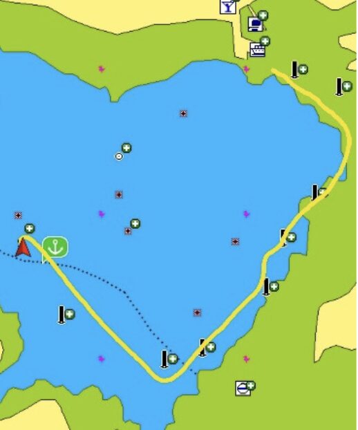 Our track is in purple (zoomed out so the red and green buoys near the entrance aren’t shown) on the following screenshot from our chart plotter: