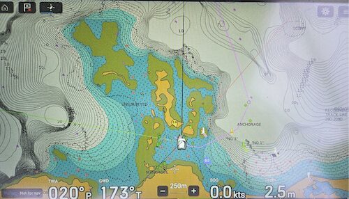 There were two lat/longs provided by our agent to anchor which are shown as anchor symbols on our chart plotter, below. In practice these are taken up by up to a dozen 30m plus Galapagos-based mini cruise ships, so we anchored further in as shown on our chart plotter: