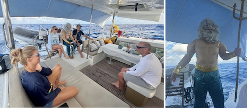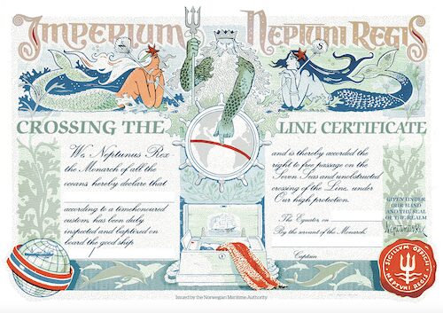 About 60 miles from Galapagos you sail over the equator, so watch out for King Neptune arriving to hold court; see King Neptune’s Court Proceedings document and the sample certificate in the Appendix.