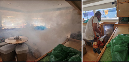 Before fumigation all fresh food and cutlery had to be removed and air conditioning turned off. From the outside looking in through the windows, poor Hawkeye’s interior was a complete wall of white mist! Our eleven smoke alarms were most unhappy. We sat in a bar for three hours to wait for the fumes to die down before going on board and ventilating.
