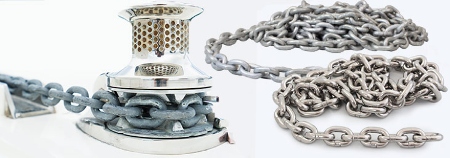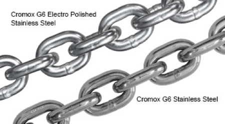 A Stainless Steel anchor chain is generally available in G3, G4, G6 and G6+. As the denotation implies, stainless steel AISI 318LN G6+ is almost as strong as galvanised grade 70.
