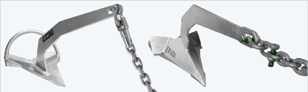 A Rocna Anchor with Kong Swivel anchor connector and bow shackle for articulation, and a Sarca Anchor with two shackles connecting to the anchor chain.
