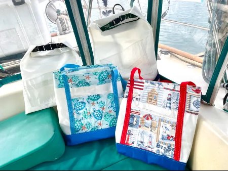 I paid a man to help me sew a new bimini before we left. That one project was so complex that after completing it, there wasn’t a thing I couldn’t fabricate. Since then, I’ve made dinghy covers, sail covers, sail bags, cushion covers, engine covers and made many sail repairs. It’s a useful hobby and has even earned us some money along the way. I collect and recycle sails that are being thrown away and make them into my own form of art. They make great gifts and keep sails out of landfills as it takes hundreds of years for them to decompose.