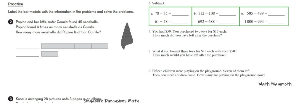 - Singapore Dimensions Math and Math Mammoth – the math concept is harder on the left-hand Singapore Math workpage, but it will be relatively easier for most students because of the pictorial element and more space to do the work. In math it’s important to pay attention to layout and space for working. Some students do very well with the more cramped Math Mammoth pages on the right, but some do not – it is a question of visual maturity, not math ability.