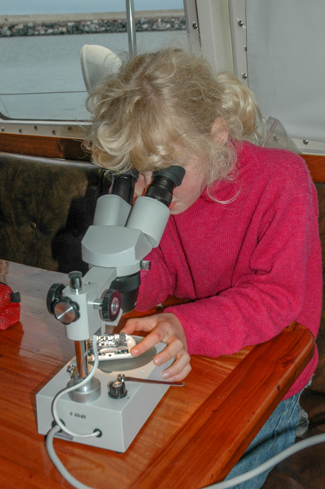 - Helen checking out a broken piece of electronics in the stereoscope microscope
